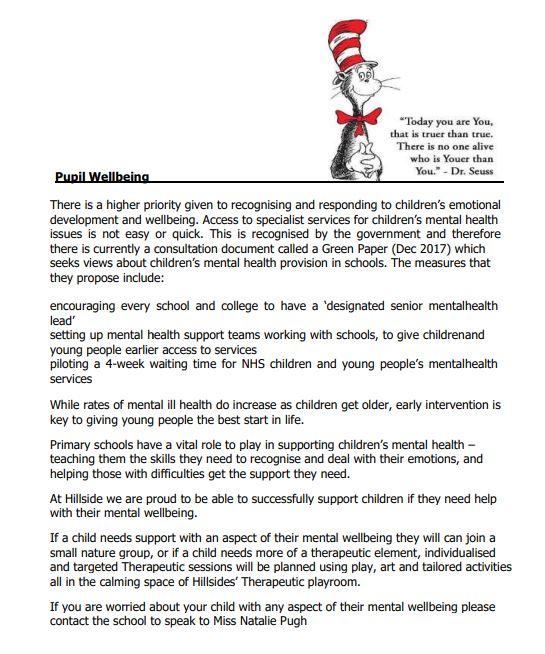 We are committed to supporting the mental health and wellbeing of our pupils and supporting their families to find good quality support and information. Hillside Infant School have set up a group with other local schools to develop our ability to respond and cater for a range of needs.